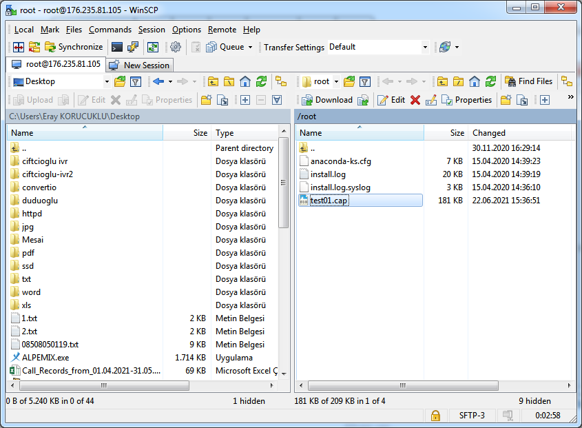 ctrl+c tuşlaması ile işlem sonlandırıldıktan sonra ilgili dosya winscp ile bağlanılarak sunucudan çekilir.