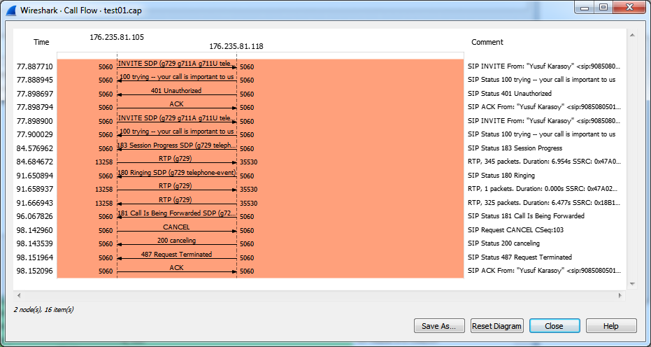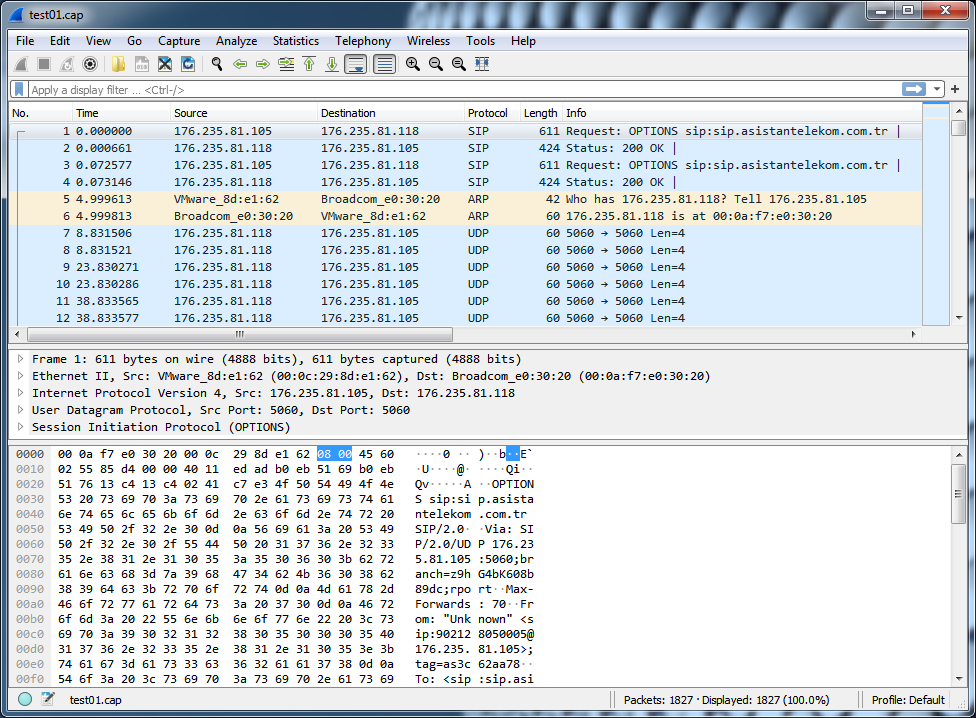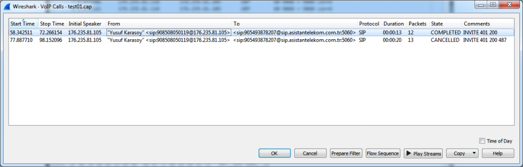 komutu ile Asistan sunucusu 0’ncı ethernet portu ile 176.235.81.118 asistan sip santrali arasındaki network trafiği test01.cap ismi ile sisteme kaydedilmeye başlar.