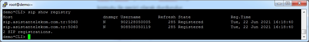 sip show registry komutu ile hangi hattın hangi port üzerinden register olduğunu yada olmadığını görebiliriz.