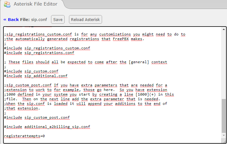 Resimdeki gibi registerattempts=0 komutu eklenir. Sonrasında sırasıyla Save ve Reload Asterisk tıklanır.