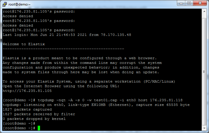 [root@demo ~]# tcpdump -nqt -A -s 0 -w test01.cap -i eth0 host 176.235.81.118