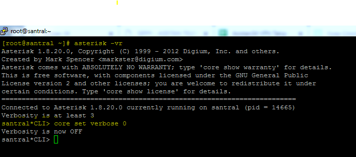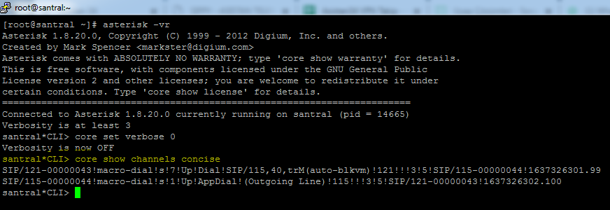 asterisk -vr komutuyla asterisk arayüzüne girilir.