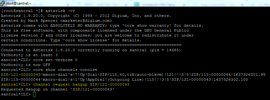 channel request hangup SIP/121-00000043 komutu ile 121 dahilisinin aramasını sonlandırıyoruz.