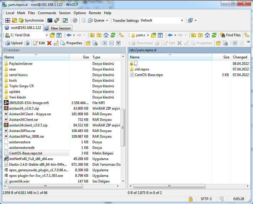 Sonrasında Sunucuda etc/yum.repos.d klasörüne girilir. burada old.repos adında yeni klasör açarak buradaki mevcut dosyaları yeni açılan klasörün içine atıyoruz. sonarsında bilgisayarımızdaki Centos-Base.repo.txt dosyasını sunucuda etc/yum.repos.d klasörüne atıyoruz. ve dosya adını Centos-Base.repo olarak değiştiriyoruz. Bu aşamadan sonra putty ile bağlanıp asistaninstallwithssd ile asistan kurulumu yapılır.